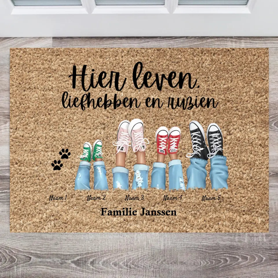 Hier leven, liefhebben en ruziën - Persoonlijke familie deurmat (1-8 personen, kinderen, huisdieren)